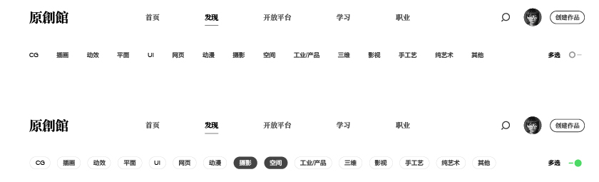 在內(nèi)容篩選方面,新版網(wǎng)站通過開關(guān)形式來進行單選資源分類與多選資源分類的區(qū)別。在用戶操作形式上,讓用戶免去思考過濾繁瑣的信息,可以快速篩選內(nèi)容;在視覺形式上,簡化了頭部的區(qū)域。